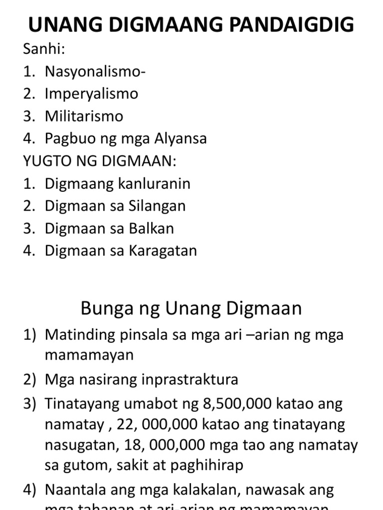 Napakaraming ari- arian ang nawasak at naantala ang kalakalan pagsasaka at iba pang gawaing pangkabuhayan. At ang paglaya ng ilang kolonya tulad ng Finland Estonia Latvia at Lithuania. Sa paksang ito ating pag-aaralan ang sanhi ng pag-umpisa ng unang digmaan.