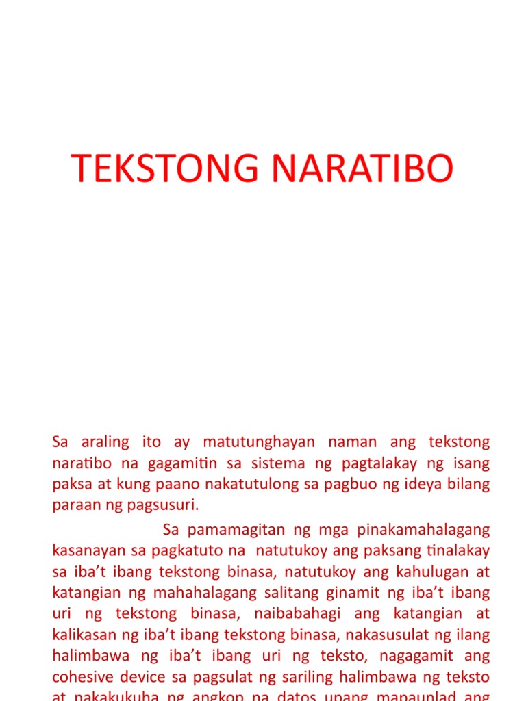 Ang tekstong narativ o narrative sa Ingles ay isang uri ng teksto na naglalahad ng magkakasunod-sunod na mga pangyayari. Contextual translation of halimbawa ng buod ng deskriptiv into Tagalog. Ang pagkain ng sapat ay nakakasama sa katawan ang pagkain naman ng sobra ay hindi rin nakakabuti.